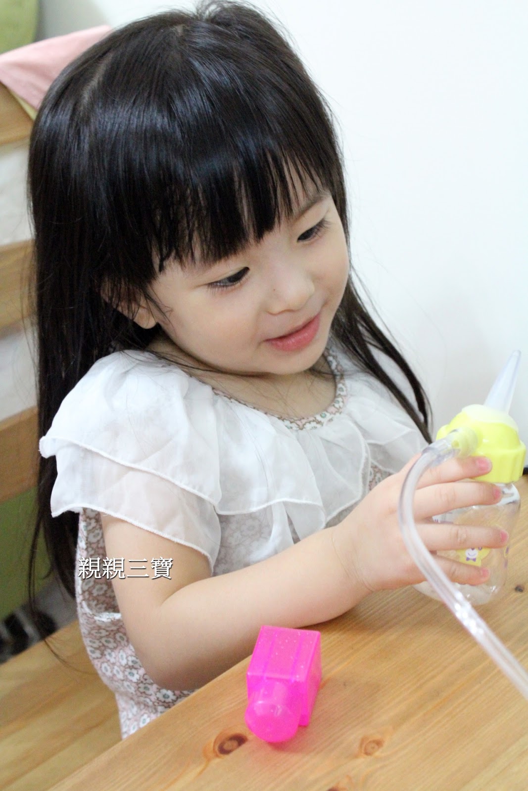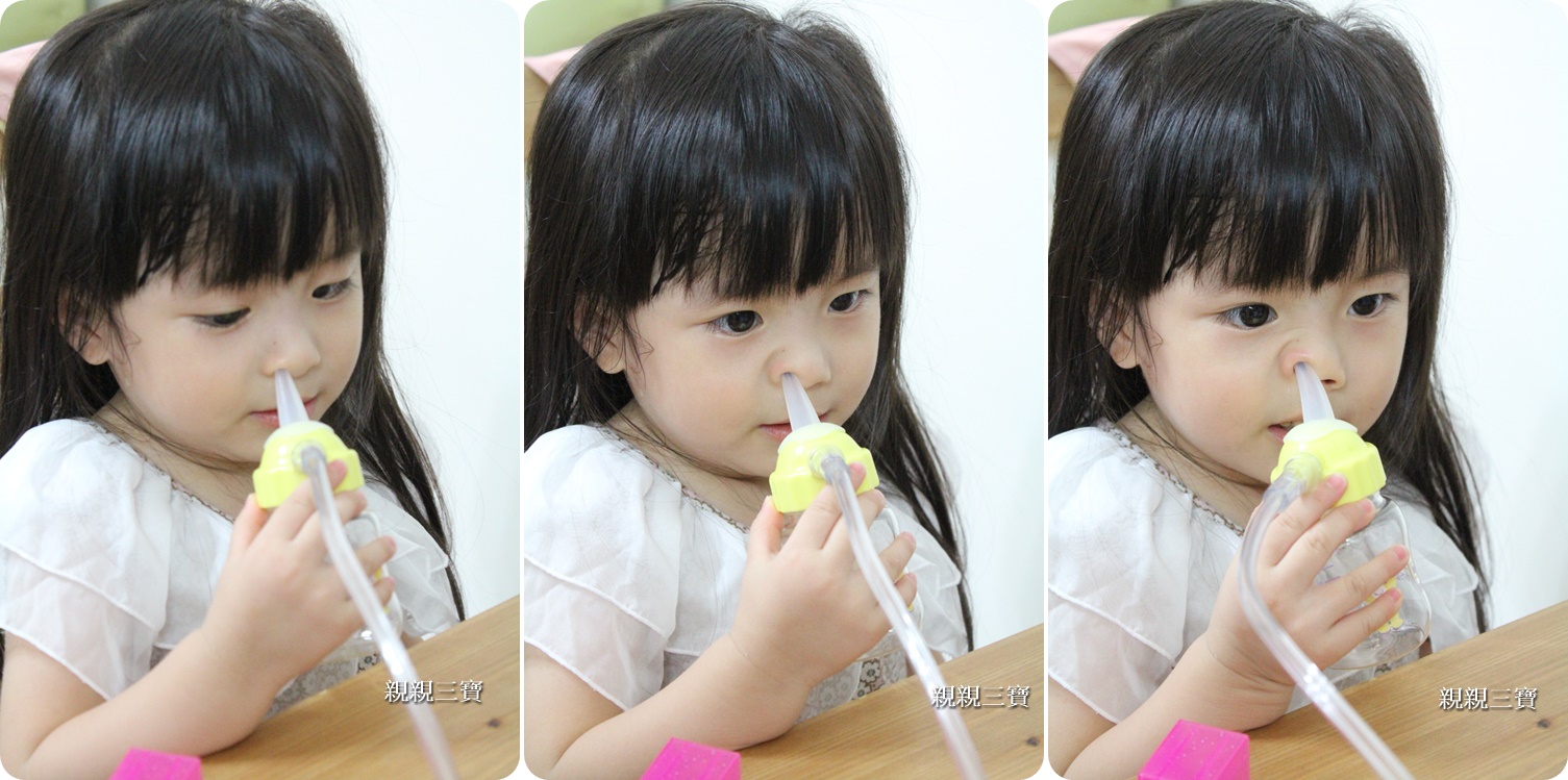 再來換換吸鼻功能,一開始雙寶妞想到另一台吸鼻器就不太敢試,一直把玩著瓶子