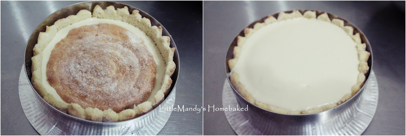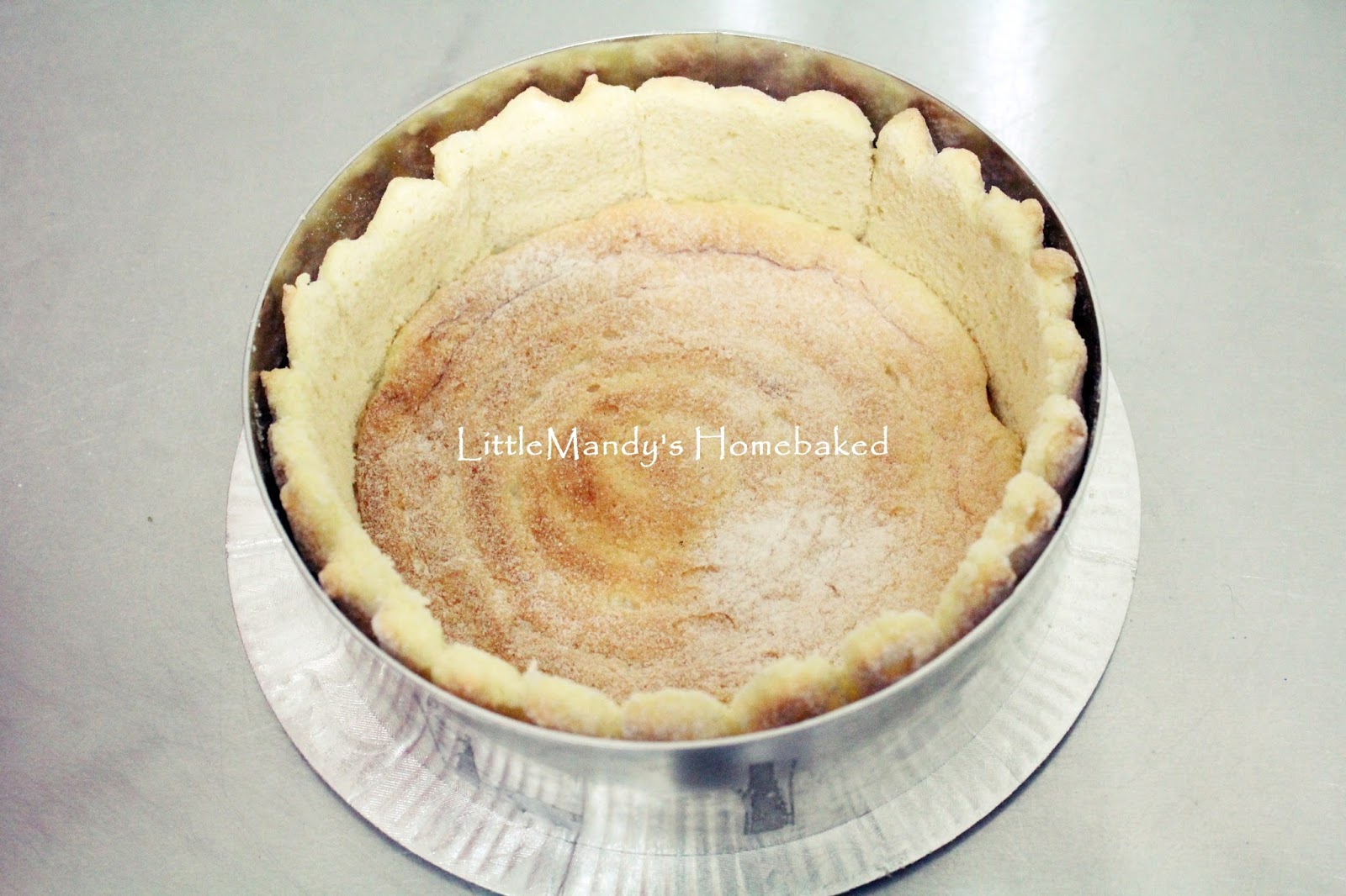 1.先取圍邊放入慕斯圈,如斷裂則繼續補滿整圈為止,務必要密合,乳酪餡才不會溢出2.再取一片圓形蛋糕片稍微修剪塞入底部後備用