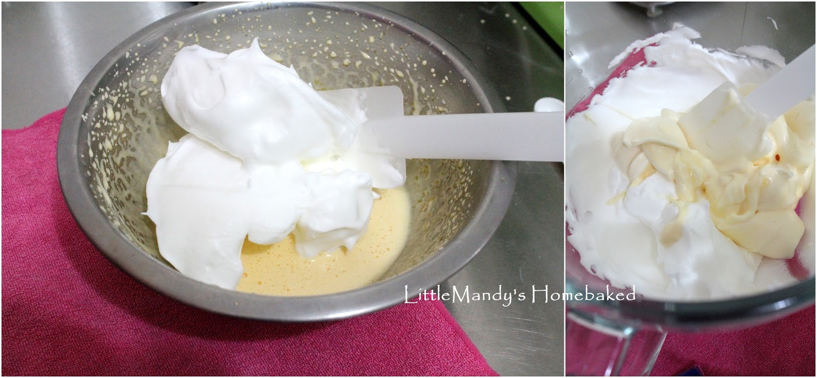 3.先挖一大匙的蛋白霜到蛋黃糊中均勻攪拌,再將蛋黃麵糊到回剩餘的蛋白霜中,用橡皮括刀小力拌勻