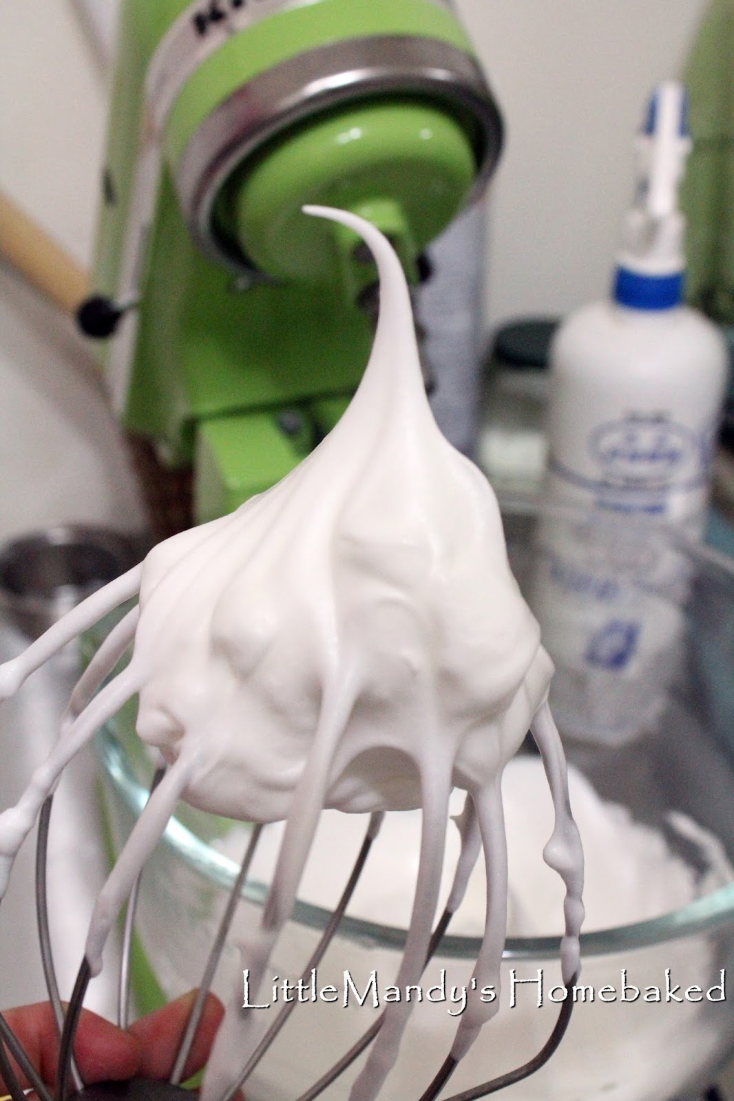 2.B材料蛋白+檸檬汁快速攪半後,加入所有砂糖續打,一直打到乾性發泡,拉起蛋白霜可直立狀