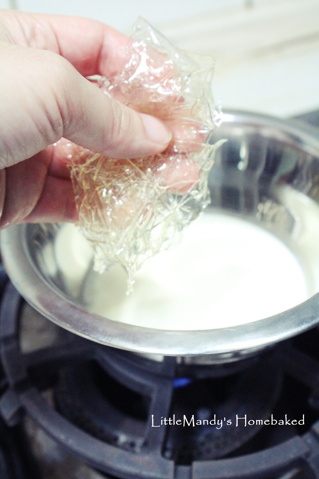 1.吉利丁泡冰水軟化(泡冰水才不會整個融化)
