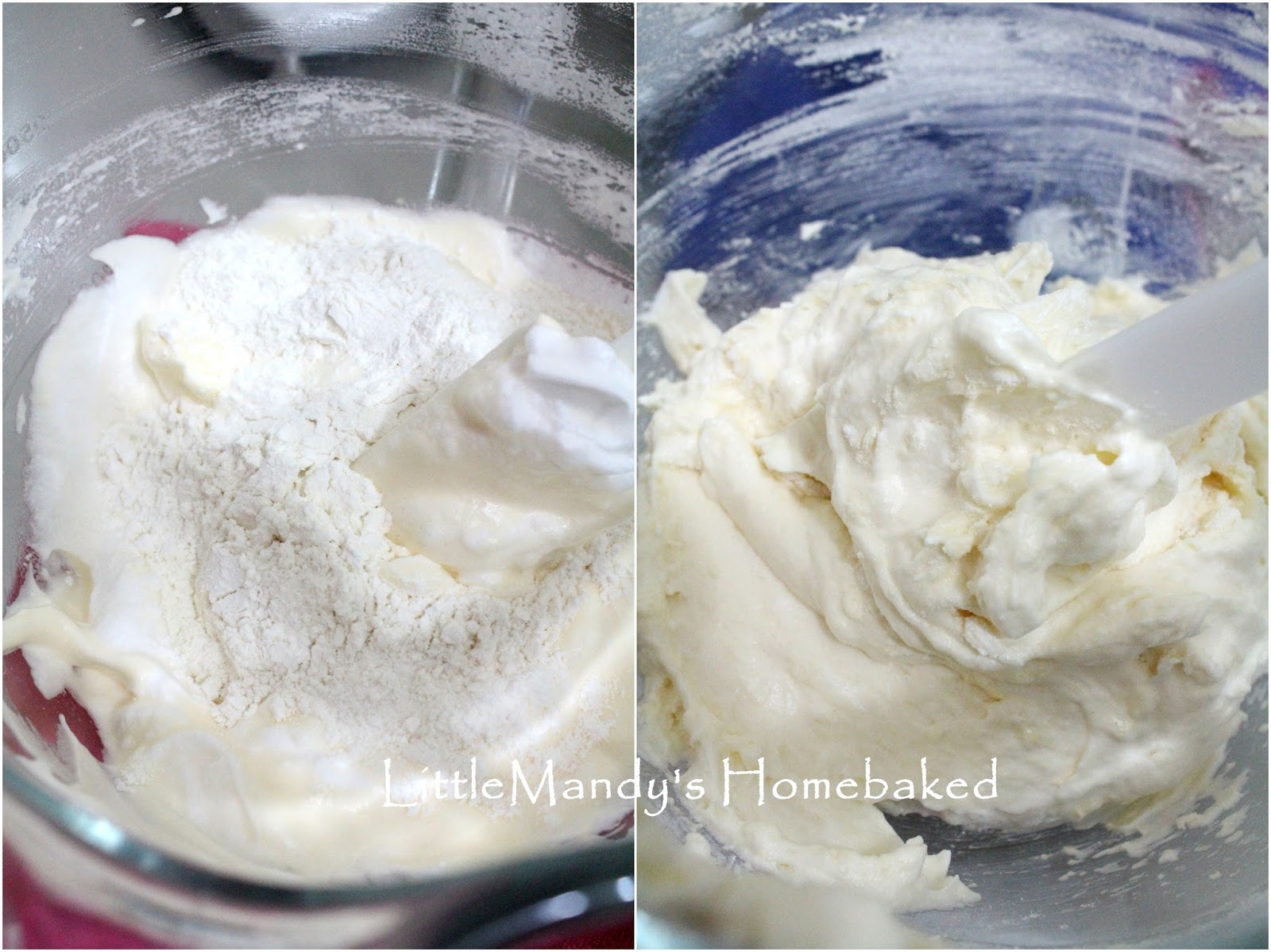 4.將過篩的低粉分次加入麵糊中,用橡皮括刀混合切拌,不須拌到均勻,剩餘有些粉也沒關係,如此比較不會消泡