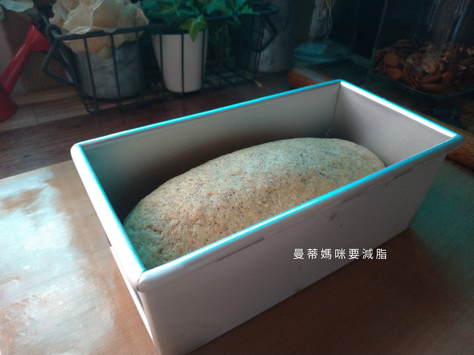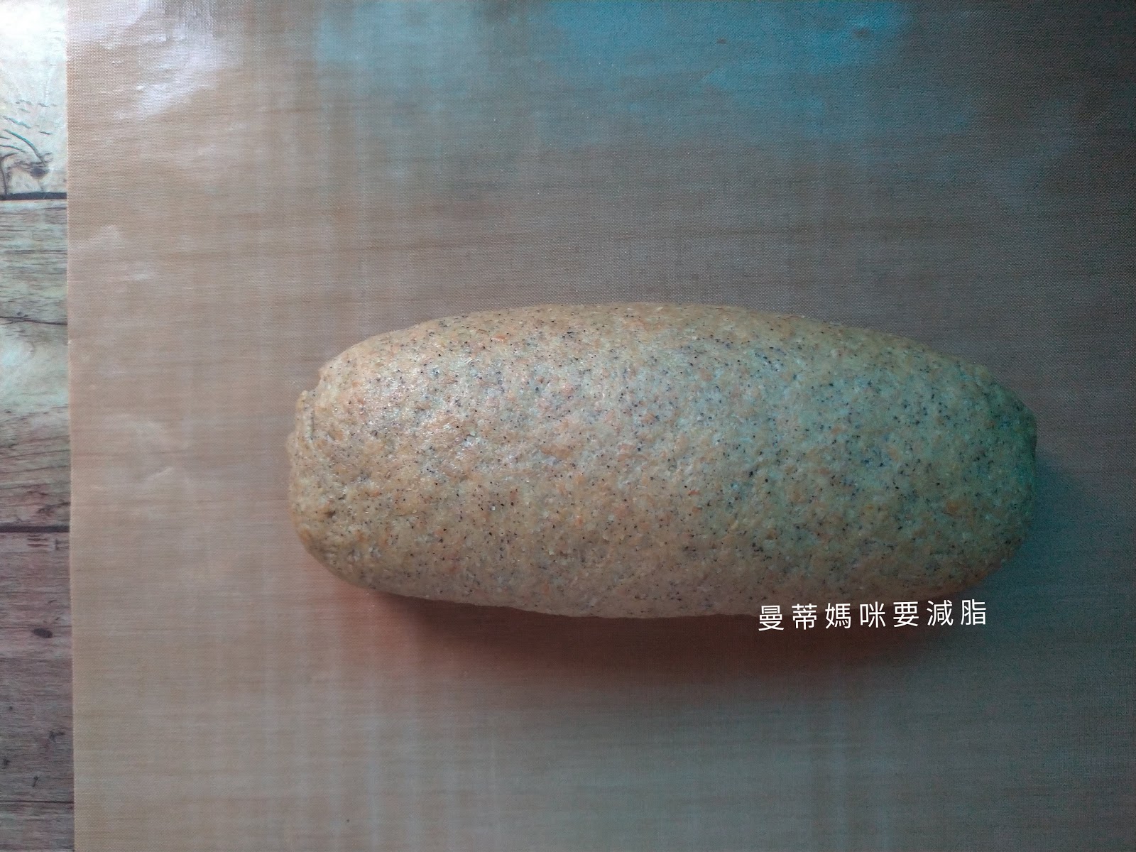 4.時間到取出稍排氣,桿平表面,翻面後捲起麵團,用手直接將麵團盡量整平,收口捏緊,放進已噴油的模具內後發約60~90分不等,一定要看到麵團有膨脹,沒有如期膨脹,烤後通常乾硬